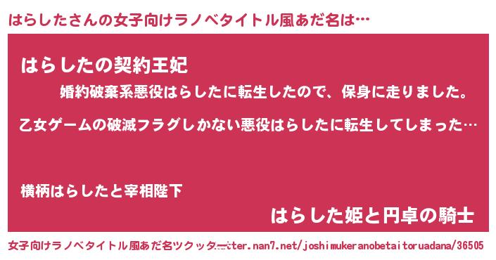 はらしたさんの女子向けラノベタイトル風あだ名は… 『乙女ゲームの破滅フラグしかない悪役はらしたに転生してしまった…』『はらしたの契約王妃』『はらした姫と円卓の騎士』 ツクッター #女子向けラノベタイトル風あだ名ツクッター http://tkutter.nan7.net/joshimukeranobetaitoruadana/36505/