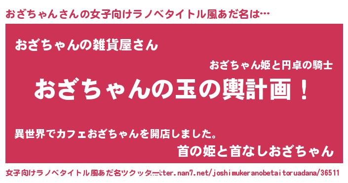 | 男性向けラノベタイトル風あだ名 | 『おざちゃん~年齢イコール彼女いない歴の魔法使い~』 |