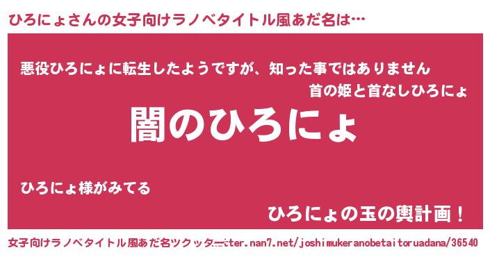 | 男性向けラノベタイトル風あだ名 | 『Re:ひろにょから始める異世界生活』 |