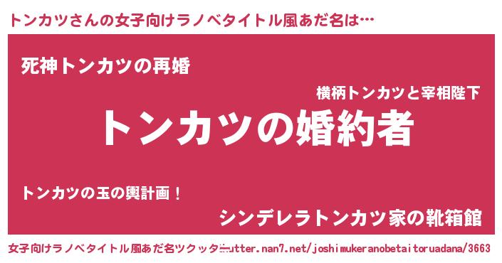 | 男性向けラノベタイトル風あだ名 | 『うちの娘の為ならば、俺はもしかしたらトンカツも倒せるかもしれない。』 |