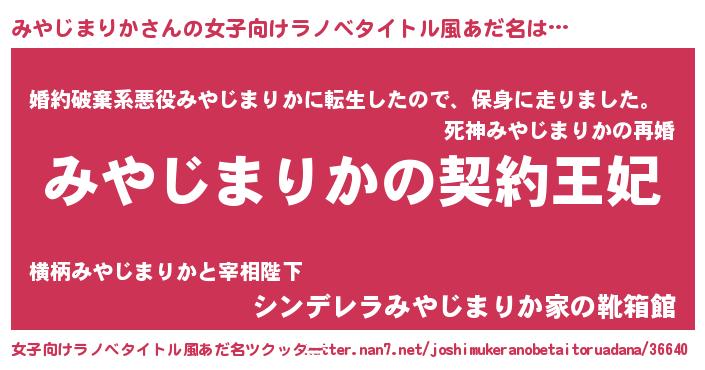| 男性向けラノベタイトル風あだ名 | 『誰もが恐れるあのみやじまりかが、ぼくの専属メイドになるようです。』 |