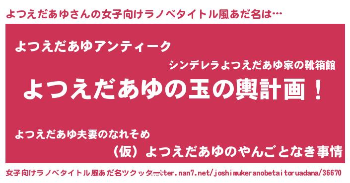 | 男性向けラノベタイトル風あだ名 | 『よつえだあゆ~年齢イコール彼女いない歴の魔法使い~』 |