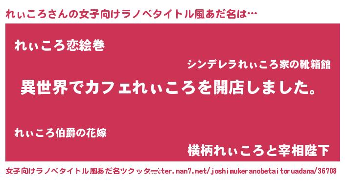 れぃころさんの女子向けラノベタイトル風あだ名は… 『異世界でカフェれぃころを開店しました。』『れぃころ恋絵巻』『横柄れぃころと宰相陛下』 ツクッター #女子向けラノベタイトル風あだ名ツクッター http://tkutter.nan7.net/joshimukeranobetaitoruadana/36708/
