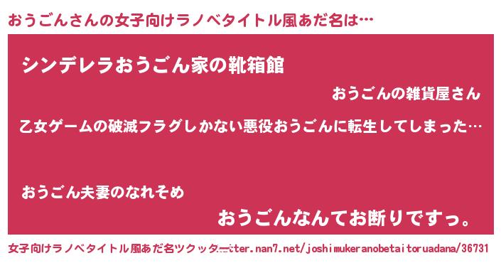 | 男性向けラノベタイトル風あだ名 | 『この素晴らしい世界におうごんを!』 |