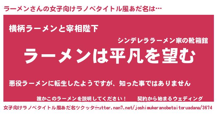 | 男性向けラノベタイトル風あだ名 | 『ダンジョンにラーメンを求めるのは間違っているだろうか』 |