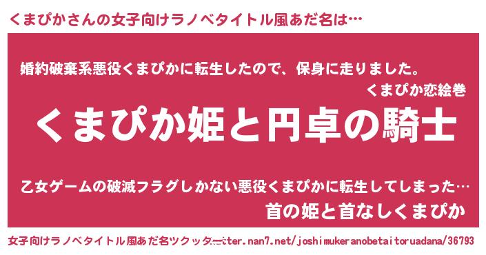 | 男性向けラノベタイトル風あだ名 | 『くまぴかの憂鬱』『クマピカスレイヤー』 |