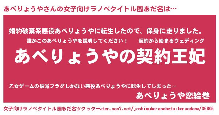 あべりょうやさんの女子向けラノベタイトル風あだ名は… 『あべりょうやの契約王妃』『婚約破棄系悪役あべりょうやに転生したので、保身に走りました。』『あべりょうや恋絵巻』 ツクッター #女子向けラノベタイトル風あだ名ツクッター http://tkutter.nan7.net/joshimukeranobetaitoruadana/36805/