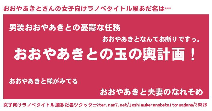 | 男性向けラノベタイトル風あだ名 | 『おおやあきと~年齢イコール彼女いない歴の魔法使い~』 |