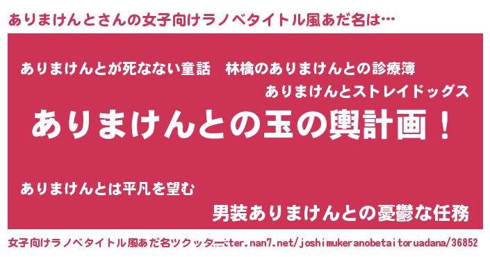 | 男性向けラノベタイトル風あだ名 | 『ありまけんと~年齢イコール彼女いない歴の魔法使い~』 |