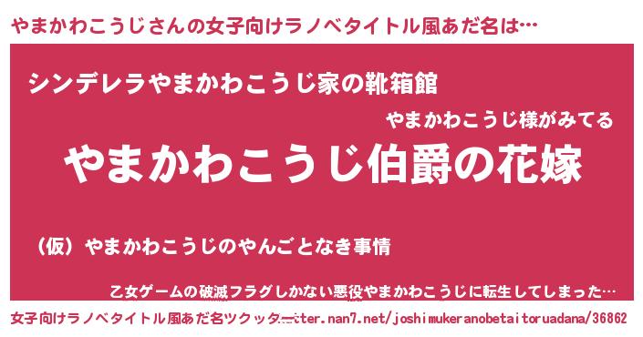 | 男性向けラノベタイトル風あだ名 | 『うちの娘の為ならば、俺はもしかしたらやまかわこうじも倒せるかもしれない。』 |