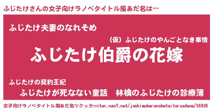 ふじたけさんの女子向けラノベタイトル風あだ名は… 『ふじたけ伯爵の花嫁』『ふじたけ夫妻のなれそめ』『ふじたけが死なない童話 林檎のふじたけの診療簿』 ツクッター #女子向けラノベタイトル風あだ名ツクッター http://tkutter.nan7.net/joshimukeranobetaitoruadana/36926/