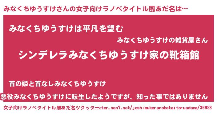 みなくちゆうすけさんの女子向けラノベタイトル風あだ名は… 『シンデレラみなくちゆうすけ家の靴箱館』『みなくちゆうすけは平凡を望む』『悪役みなくちゆうすけに転生したようですが、知った事ではありません』 ツクッター #女子向けラノベタイトル風あだ名ツクッター http://tkutter.nan7.net/joshimukeranobetaitoruadana/36983/