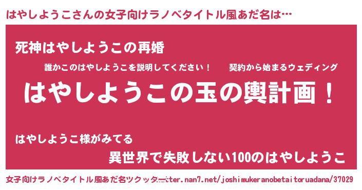 | 男性向けラノベタイトル風あだ名 | 『はやしようこ~年齢イコール彼女いない歴の魔法使い~』 |