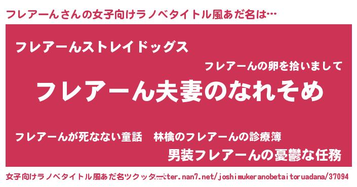 | 男性向けラノベタイトル風あだ名 | 『おまえをオタクにしてやるから、俺をフレアーんにしてくれ! 』 |