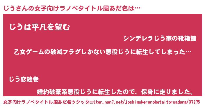 | 男性向けラノベタイトル風あだ名 | 『この素晴らしい世界にじうを!』 |