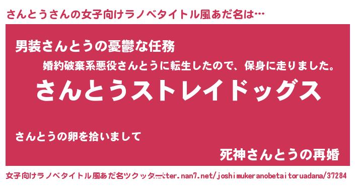 | 男性向けラノベタイトル風あだ名 | 『Re:さんとうから始める異世界生活』 |