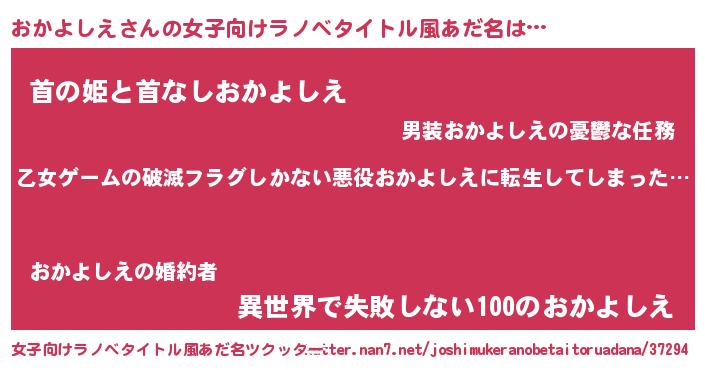 | 男性向けラノベタイトル風あだ名 | 『魔弾の王とおかよしえ』 |