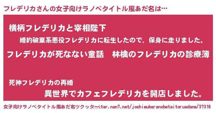 フレデリカさんの女子向けラノベタイトル風あだ名は… 『フレデリカが死なない童話 林檎のフレデリカの診療簿』『横柄フレデリカと宰相陛下』『異世界でカフェフレデリカを開店しました。』 ツクッター #女子向けラノベタイトル風あだ名ツクッター http://tkutter.nan7.net/joshimukeranobetaitoruadana/37316/