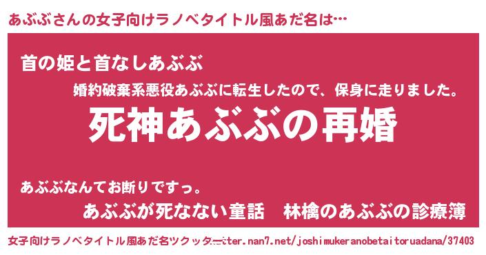 | 男性向けラノベタイトル風あだ名 | 『ノーゲーム・ノーアブブ』 |