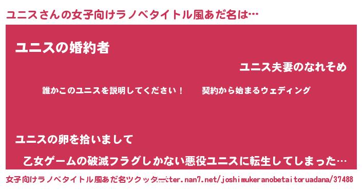 ユニスさんの女子向けラノベタイトル風あだ名は… 『誰かこのユニスを説明してください! ~契約から始まるウェディング~』『ユニスの婚約者』『乙女ゲームの破滅フラグしかない悪役ユニスに転生してしまった…』 ツクッター #女子向けラノベタイトル風あだ名ツクッター http://tkutter.nan7.net/joshimukeranobetaitoruadana/37488/