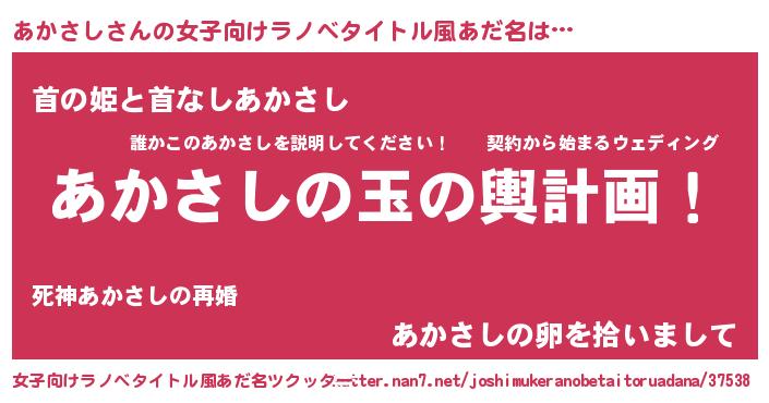 | 男性向けラノベタイトル風あだ名 | 『あかさし~年齢イコール彼女いない歴の魔法使い~』 |