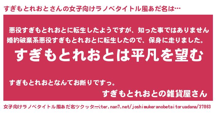| 胡散臭い通販商品みたいなあだ名 | 『信頼と実績のサプリメント…その名も「すぎもとれおと」』 |