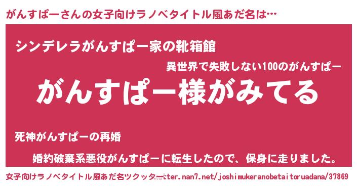 | 男性向けラノベタイトル風あだ名 | 『がんすぱーの嫁は女の子じゃないと思った?』 |