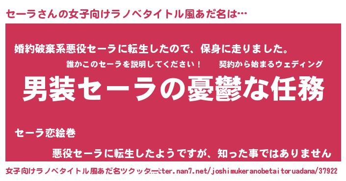 | 男性向けラノベタイトル風あだ名 | 『うちのセーラが世界を掌握している!』 |