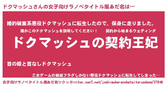 | 男性向けラノベタイトル風あだ名 | 『誰もが恐れるあのドクマッシュが、ぼくの専属メイドになるようです。』 |