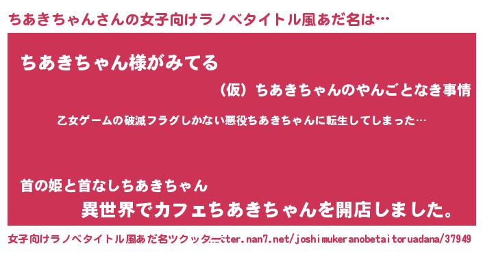 | 男性向けラノベタイトル風あだ名 | 『この素晴らしい世界にちあきちゃんを!』 |