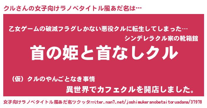 | 男性向けラノベタイトル風あだ名 | 『はたらくクルさま!』『魔弾の王とクル』 |