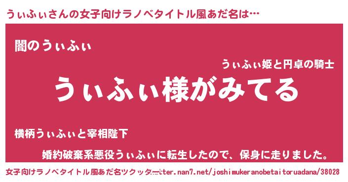 | 男性向けラノベタイトル風あだ名 | 『うぃふぃの嫁は女の子じゃないと思った?』 |