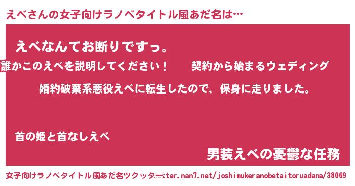 えべさんの女子向けラノベタイトル風あだ名は… 『婚約破棄系悪役えべに転生したので、保身に走りました。』『えべなんてお断りですっ。』『男装えべの憂鬱な任務』 ツクッター #女子向けラノベタイトル風あだ名ツクッター http://tkutter.nan7.net/joshimukeranobetaitoruadana/38069/