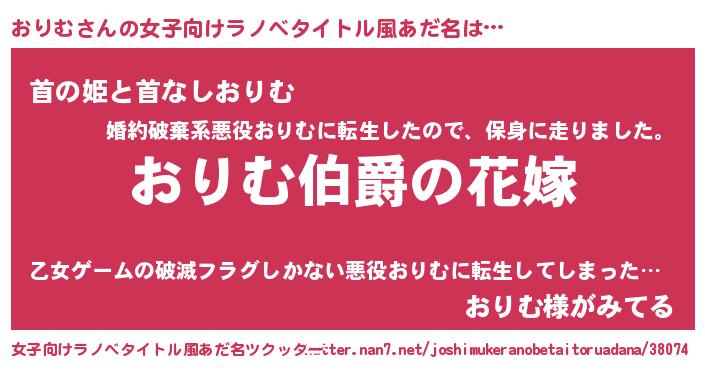 | 男性向けラノベタイトル風あだ名 | 『やはりおりむの青春ラブコメはまちがっている 』 |
