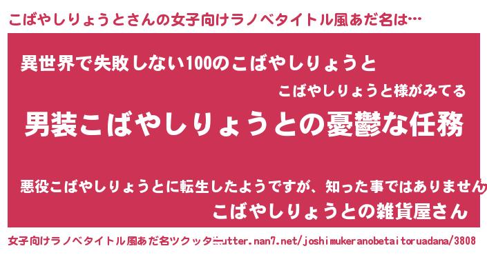 | 男性向けラノベタイトル風あだ名 | 『うちのこばやしりょうとが世界を掌握している!』 |