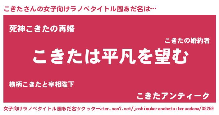 こきたさんの女子向けラノベタイトル風あだ名は… 『こきたは平凡を望む』『死神こきたの再婚』『こきたアンティーク』 ツクッター #女子向けラノベタイトル風あだ名ツクッター http://tkutter.nan7.net/joshimukeranobetaitoruadana/38259/
