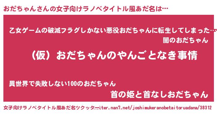 | 男性向けラノベタイトル風あだ名 | 『おだちゃんの憂鬱』 |