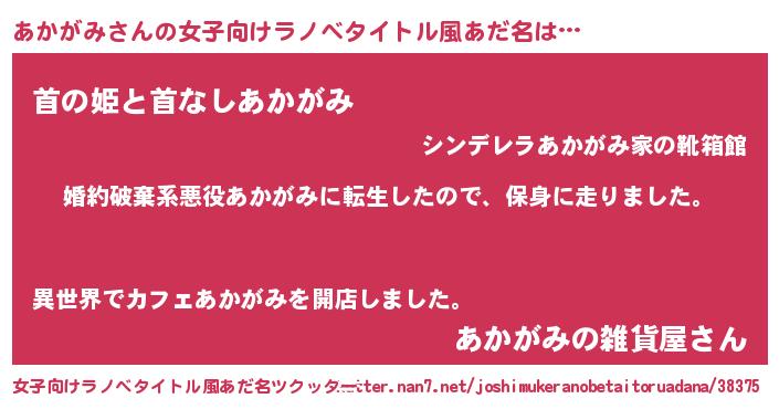 あかがみさんの女子向けラノベタイトル風あだ名は… 『婚約破棄系悪役あかがみに転生したので、保身に走りました。』『首の姫と首なしあかがみ』『あかがみの雑貨屋さん』 ツクッター #女子向けラノベタイトル風あだ名ツクッター http://tkutter.nan7.net/joshimukeranobetaitoruadana/38375/