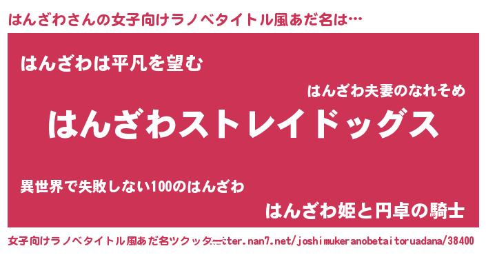 はんざわさんの女子向けラノベタイトル風あだ名は… 『はんざわストレイドッグス』『はんざわは平凡を望む』『はんざわ姫と円卓の騎士』 ツクッター #女子向けラノベタイトル風あだ名ツクッター http://tkutter.nan7.net/joshimukeranobetaitoruadana/38400/