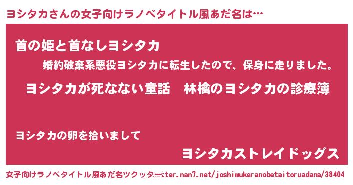 | 男性向けラノベタイトル風あだ名 | 『魔弾の王とヨシタカ』 |