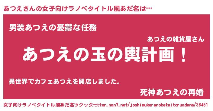 | ヒーロー風カッコイイあだ名 | 『愛の使者あつえ』『ウルトラあつえマン』 |
