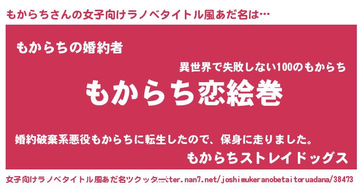 もからちさんの女子向けラノベタイトル風あだ名は… 『もからち恋絵巻』『もからちの婚約者』『もからちストレイドッグス』 ツクッター #女子向けラノベタイトル風あだ名ツクッター http://tkutter.nan7.net/joshimukeranobetaitoruadana/38473/