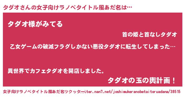 | 男性向けラノベタイトル風あだ名 | 『魔弾の王とタダオ』 |