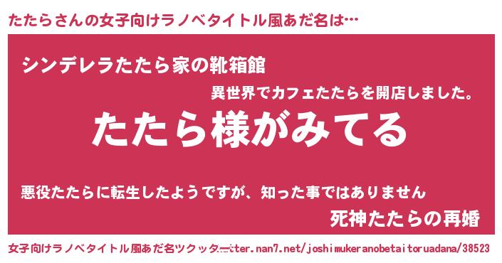 | 男性向けラノベタイトル風あだ名 | 『たたらの嫁は女の子じゃないと思った?』 |
