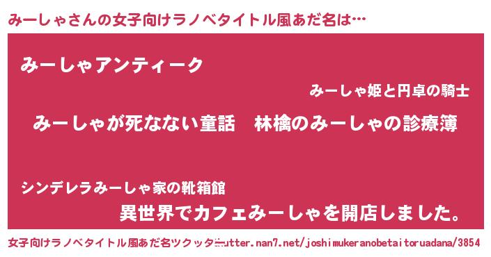 | 男性向けラノベタイトル風あだ名 | 『魔弾の王とみーしゃ』『みーしゃの憂鬱』 |