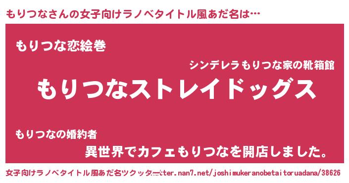 | 男性向けラノベタイトル風あだ名 | 『Re:もりつなから始める異世界生活』 |