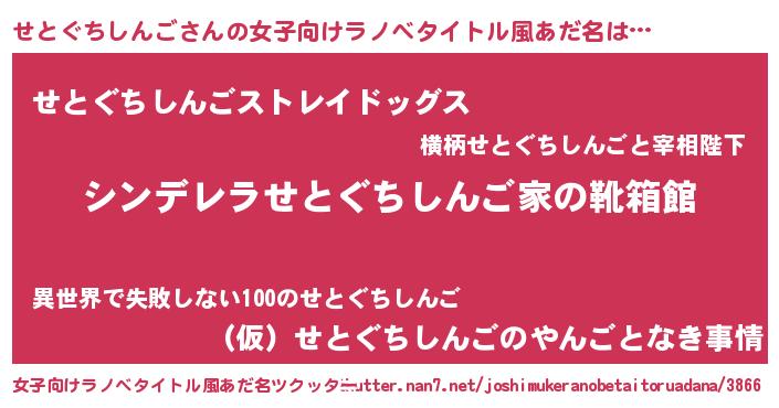| 男性向けラノベタイトル風あだ名 | 『冴えないせとぐちしんごの育てかた』 |