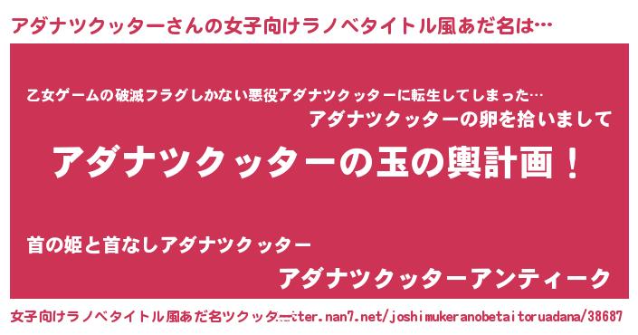 | 男性向けラノベタイトル風あだ名 | 『転生したらアダナツクッターだった件』 |