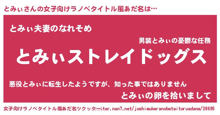 | 男性向けラノベタイトル風あだ名 | 『Re:とみぃから始める異世界生活』 |