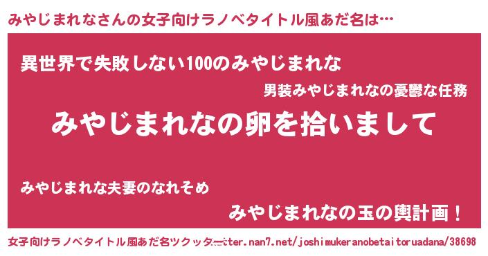 | 男性向けラノベタイトル風あだ名 | 『みやじまれなの嫁は女の子じゃないと思った?』 |